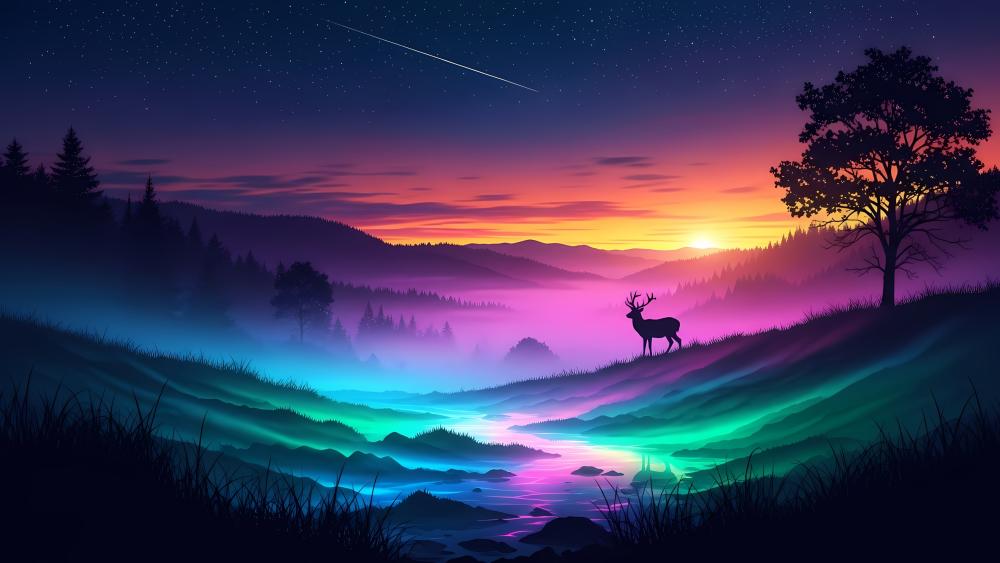 Cet arrière-plan de bureau animé présente un beau paysage d'une forêt haute en couleur illuminé par une lueur néon, avec la silhouette d'un cerf se tenant près d'une rivière, ajoutant une touche de sérénité sous un ciel étoilé.